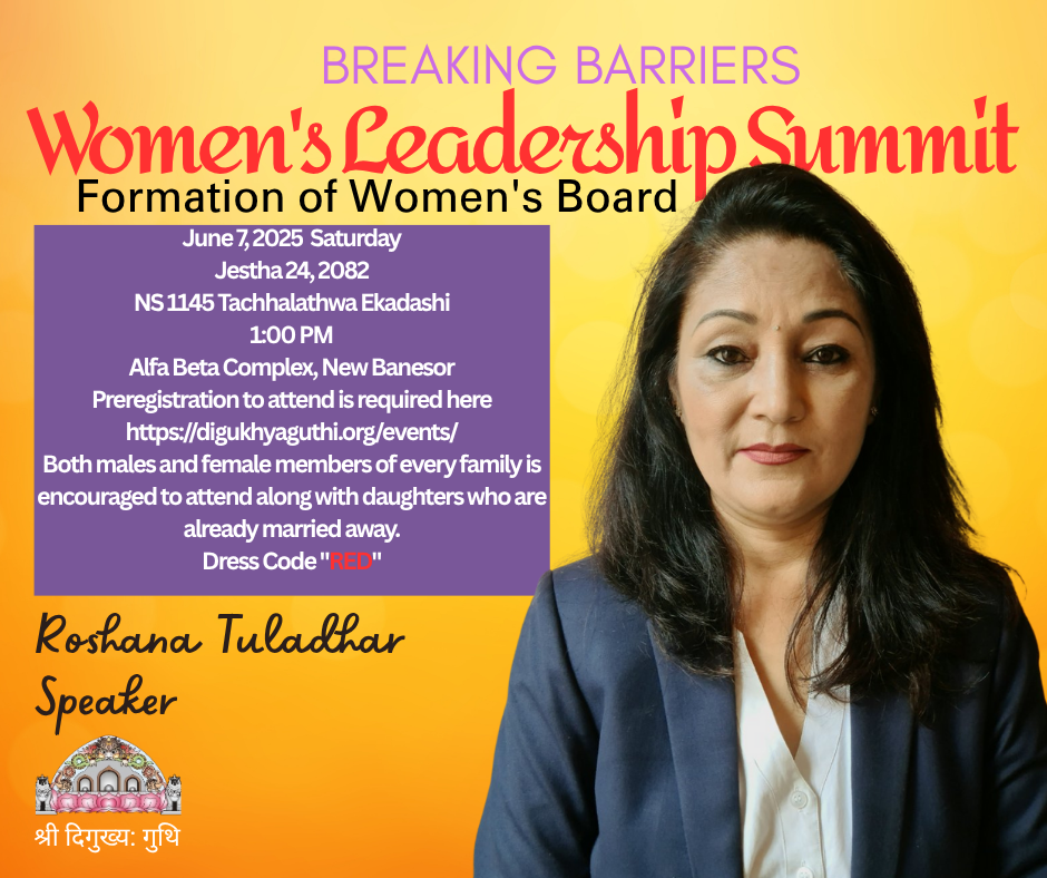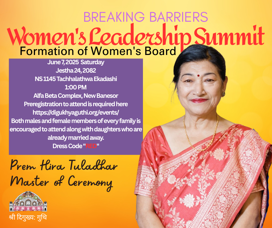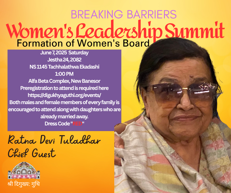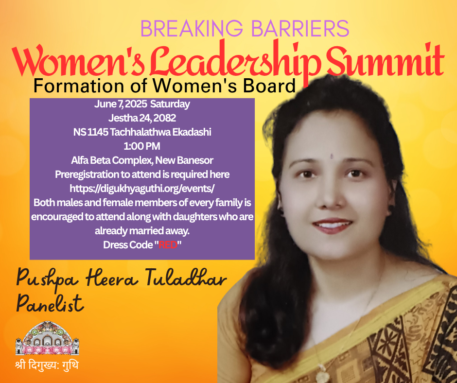 Women's leadership is an integral force in shaping societies, fostering progress, and ensuring inclusive decision-making. Despite advancements, women continue to face systemic and social barriers to leadership. The Breaking Barriers: Women's Leadership Summit, organized by Shree Digukhya Guthi, seeks to create a dynamic platform for dialogue, empowerment, and collective action to strengthen women's leadership and participation in governance, business, and community development.